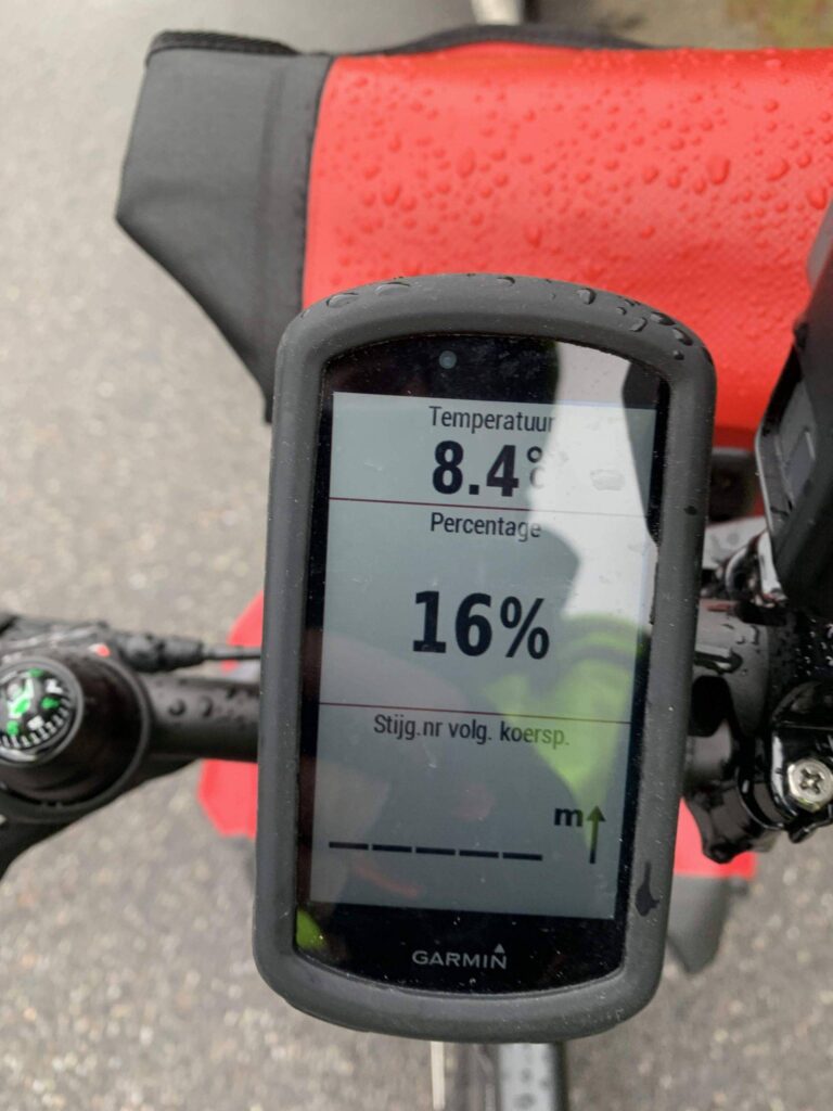 Op een gegeven moment begon het gewoon te regenen en dachten eerst aan stoppen om de regenbroek aan te trekken, maar bij zulke klimmen is hij aan de binnenkant net zo nat. Dus toch maar uit gelaten. Het mooie is als je weer ergens een bocht om gaat kan het zo maar weer droog zijn. Tja en dan blijf je bezig regenbroek aan, regenbroek uit.