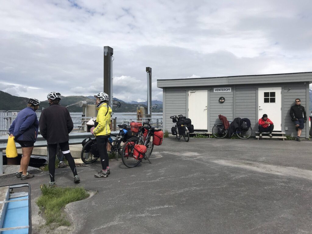 Hier waren wij niet de enige fietsers, er stonden er al 6 te wachten en de 7e kwam achter ons aan. Waarvan 1 stel op een tandem. Toen de boot arriveerde kwamen daar ook nog een stuk of 6 vanaf, die weer terug gingen.