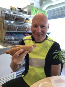 Voor we aan de klim beginnen gaan we eerst even een kopje koffie drinken in een Kiosk. Hier was de koffie gratis, komt wel vaker voor of je mag na 1 betaald kopje zoveel kopjes pakken als je wilt. Ook hebben we voor het eerst een pølser met bacon gehad.( een hotdog met spek omwikkeld). Was best lekker.