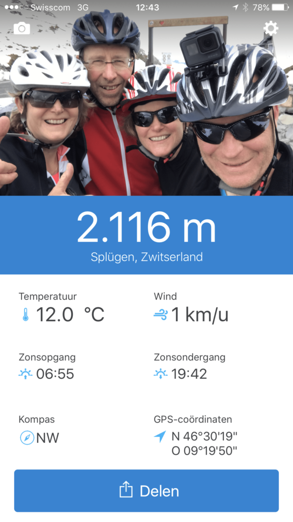 Het is 10:10 als we de fiets bestijgen en aan het klimavontuur beginnen. En die begint al vrij snel eigenlijk te snel want de spiertjes zijn nog niet echt warm om direct te klimmen, maar ja stoppen is geen optie. Das gaan we gestaag omhoog in een rustig tempo klimmen we naar de top, zo nu en dan even stoppen om wat te eten en te drinken en de foto momenten. En daar zijn we dan op de top 2117 meter hoog in een laag van 30 cm sneeuw.