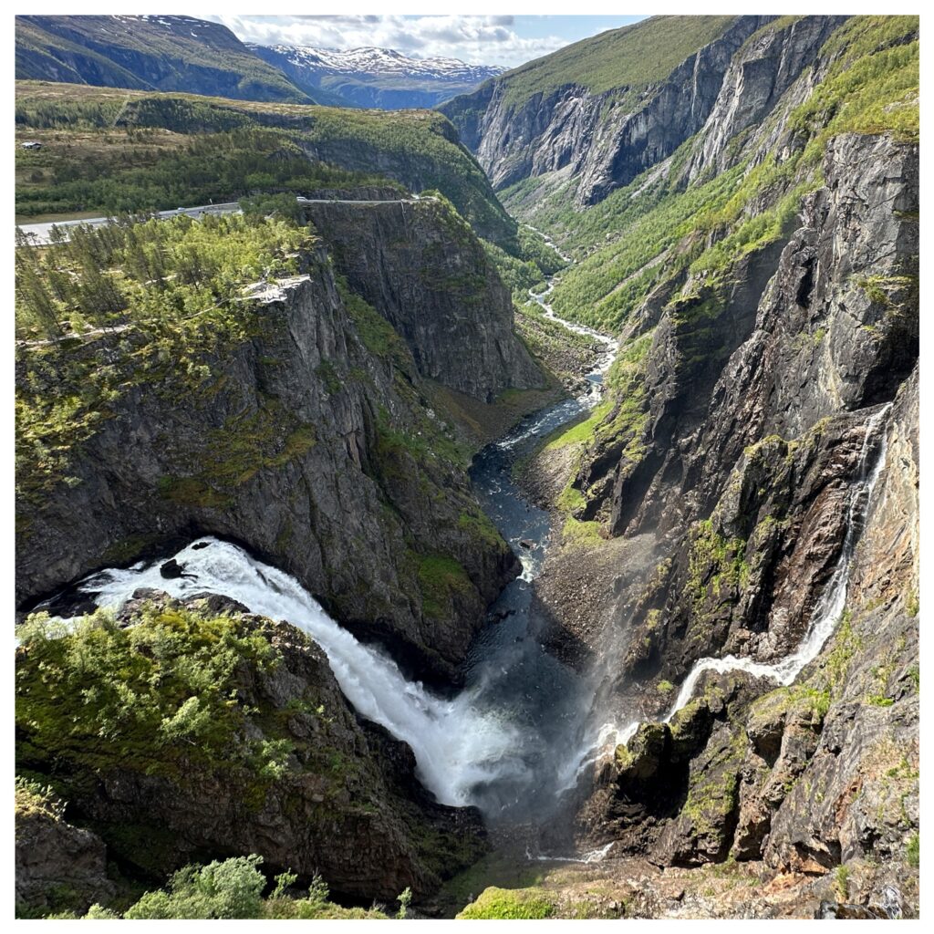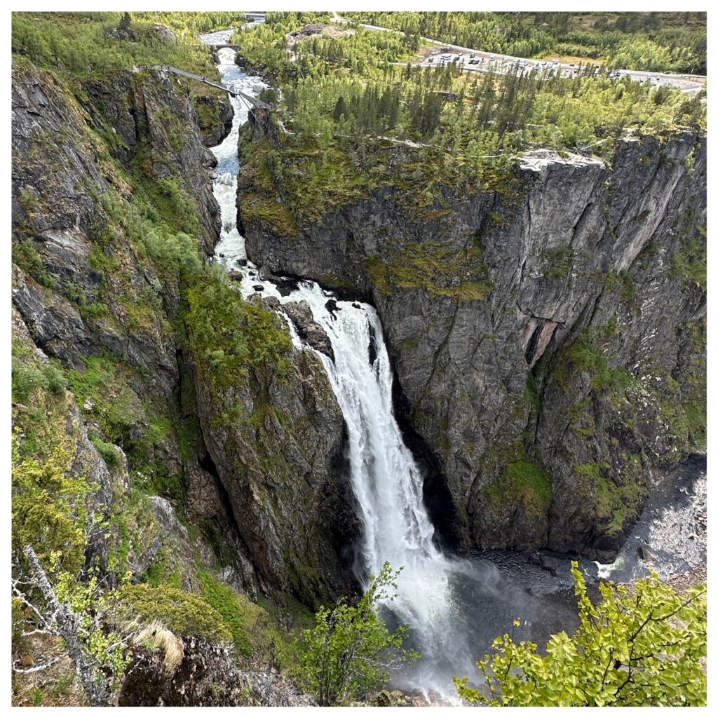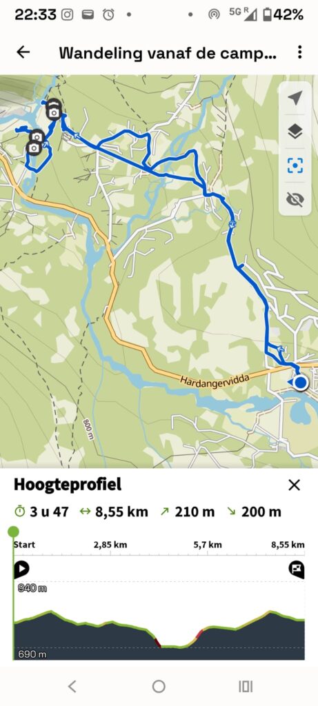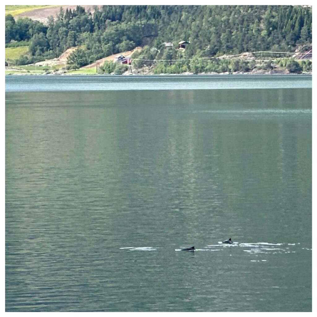 7:20 ging de wekker we gaan om 8:30 vertrekken. Even uit geweest en daarna lekker gegeten. En klokslag 8:30 zijn we vertrokken richting de camping in Garen. Vandaar uit gaan we lopen naar de Vøringsfossen (waterval). Maar eerst hebben we onderweg nog ergens in een fjord dolfijnen zien zwemmen.