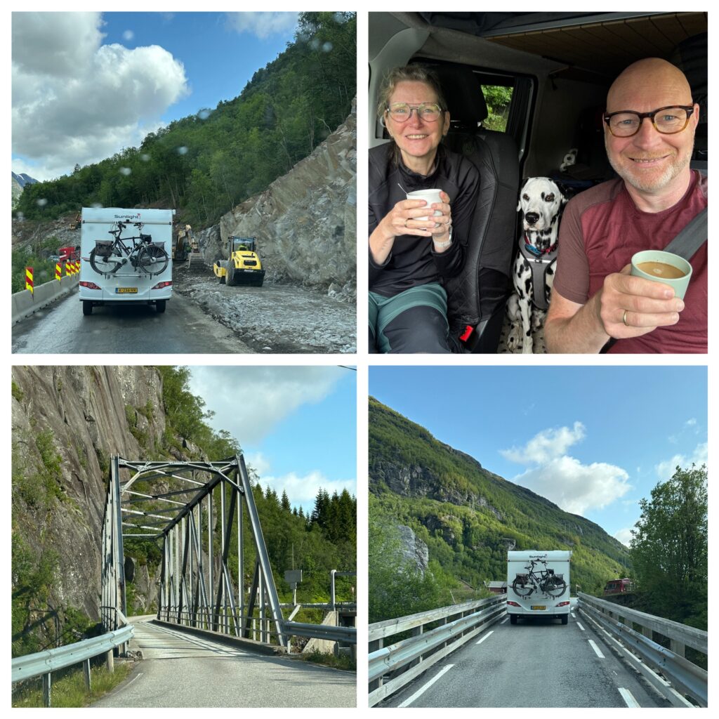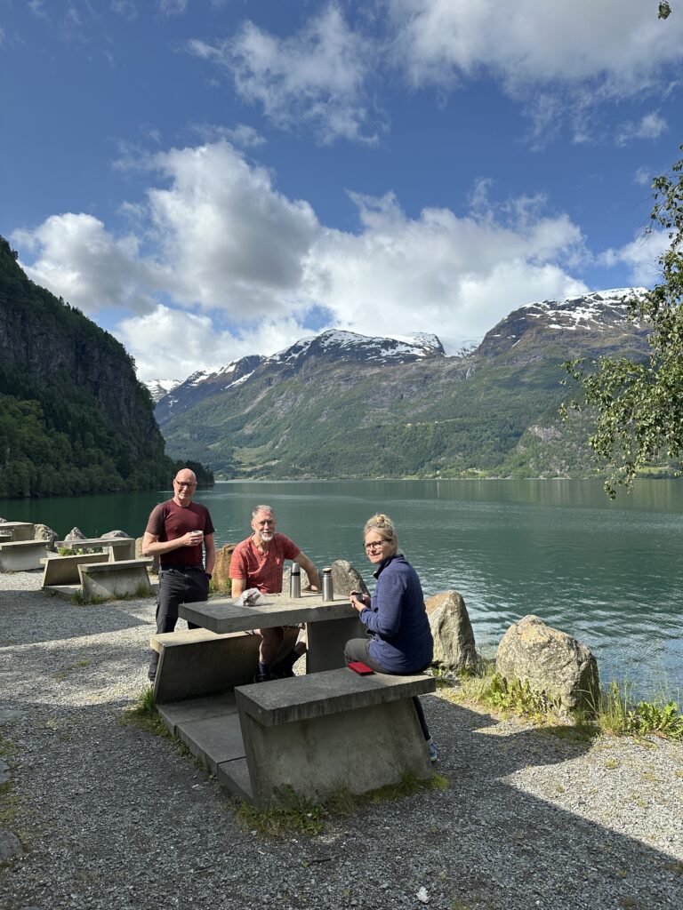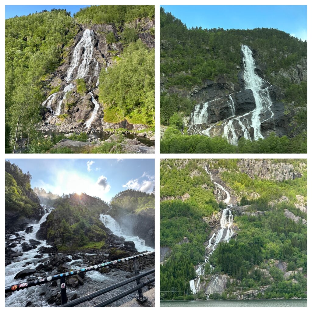 7:20 ging de wekker we gaan om 8:30 vertrekken. Even uit geweest en daarna lekker gegeten. En klokslag 8:30 zijn we vertrokken richting de camping in Garen. Vandaar uit gaan we lopen naar de Vøringsfossen (waterval). Maar eerst hebben we onderweg nog ergens in een fjord dolfijnen zien zwemmen.