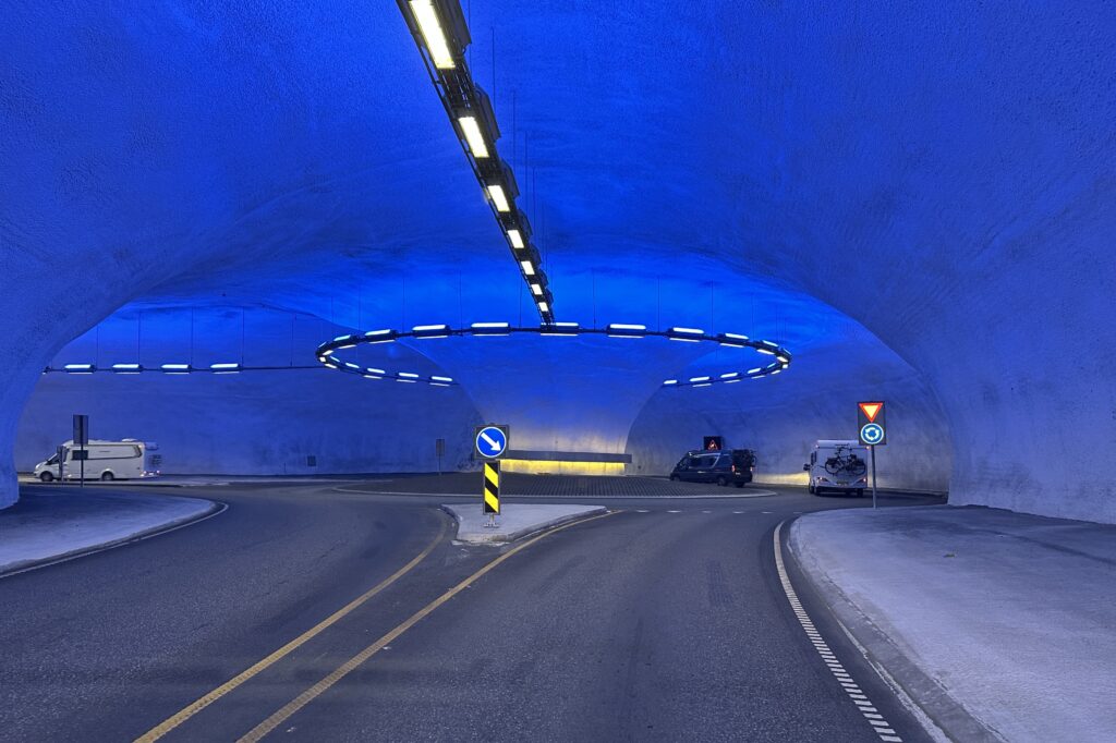 Ook moesten we regelmatig stoppen voor wegwerkzaamheden. Hier moesten we dan wachten op een volgauto en zo werden we langs de werkzaamheden geleid. Ook kwamen we nog door een tunnel met en rotonde die gehuld was in blauw licht dat was wel mooi om te zien.