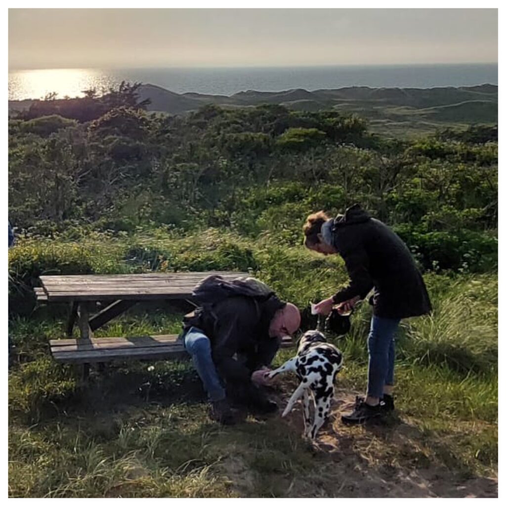 Op een gegeven moment gingen we de duinen weer in, want ja we moeten ook een keer weer terug. Dat was leuk ik liep voorop en mocht het pad kiezen waar we langs gingen. Op een gegeven moment zijn we even gestopt en toen zag Peter een teek op mij lopen en het bleef niet bij 1 maar meerdere. Gelukkig zie je bij mij wel aardig goed waar ze lopen dus ze waren gauw gevonden.