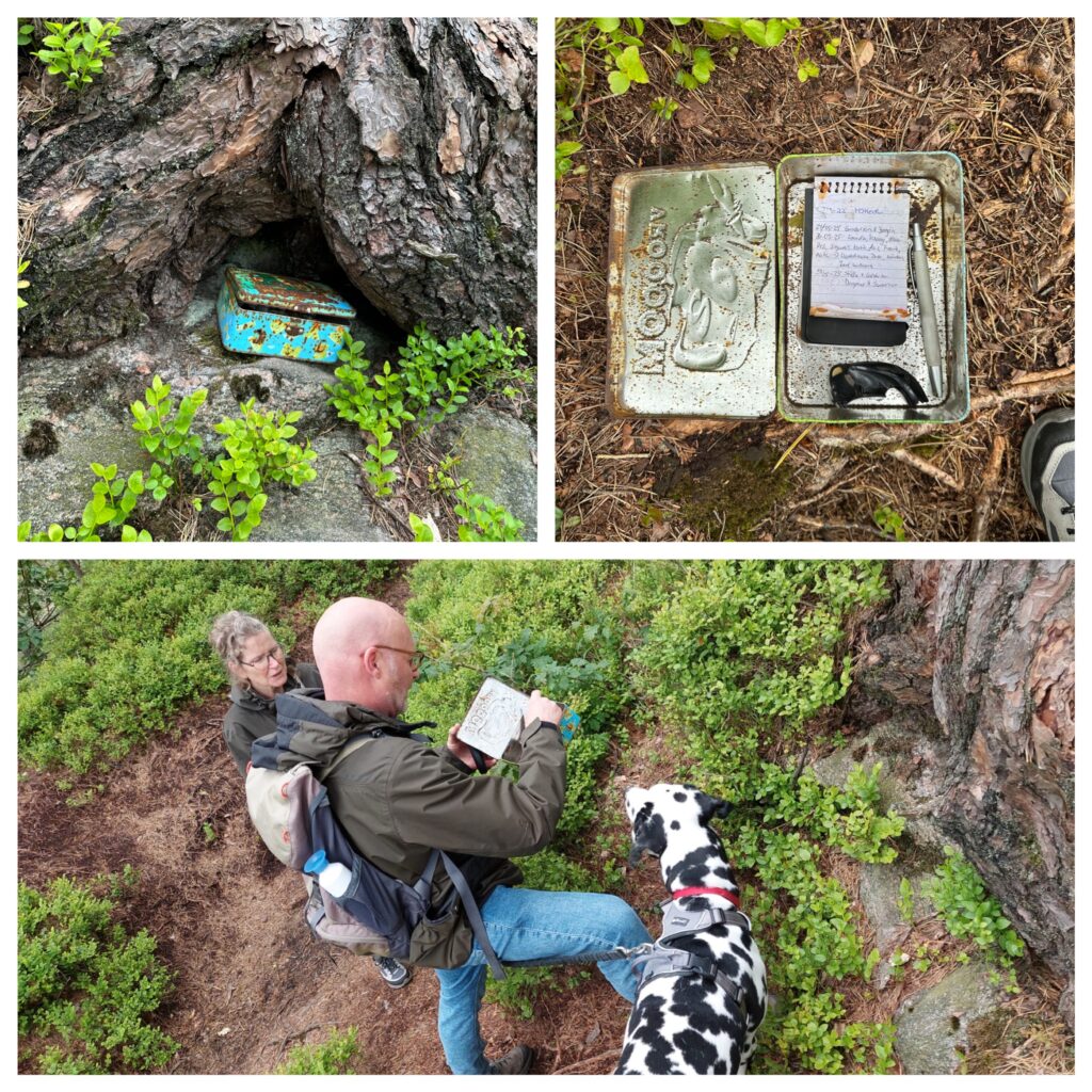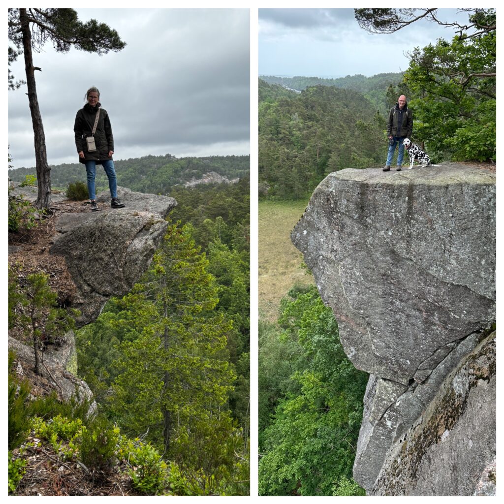 Uiteindelijk kwamen we bij de Preikestolen aan. Bleek dit de “Kleine Preikestolen” te zijn, niet minder mooi niet zo hoog natuurlijk. Maar het was toch wel een diep gat toen ik naar beneden keek. Foto’s werden gemaakt en ik keek wat rond zag ik ineens iets onder bij de wortels van de boom iets liggen. Een blikje met daarin een pen en een boekje waar men iets in kon schrijven.
