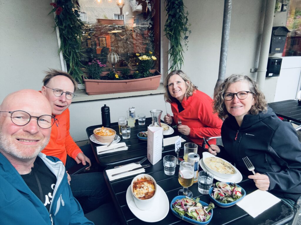 We gaan een restaurant in, nou ja in? We kunnen door een poort om buiten te zitten, want ik mag niet naar binnen. Ik krijg wel een lekkere bak water en de rest hun eten.