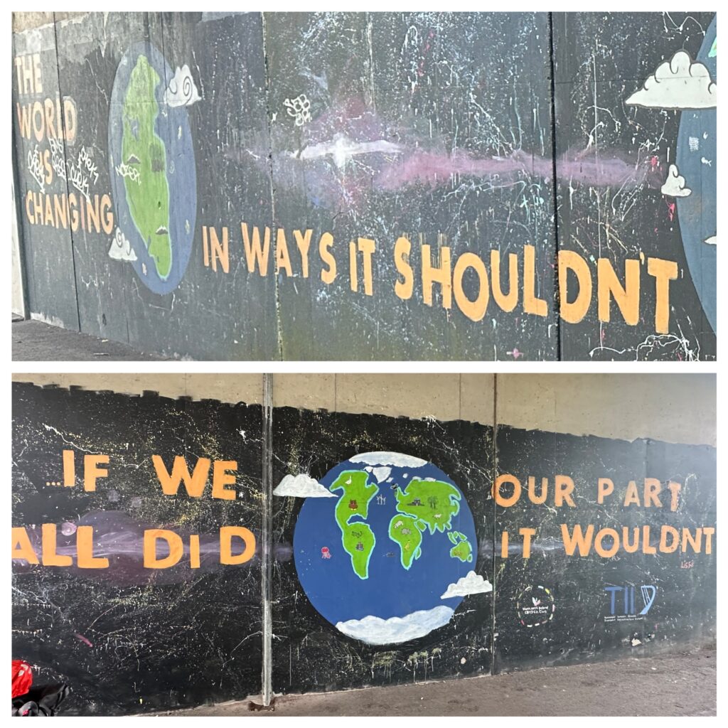 De route was vandaag vrij rustig en wat meer door de landerijen. Ook zag ik meer tractoren dan auto’s. We konden wel mooi doorfietsen. Tot het hard begon te regenen, maar even schuilen onder een viaduct. Waar Gea een hele mooie tekst zag staan.