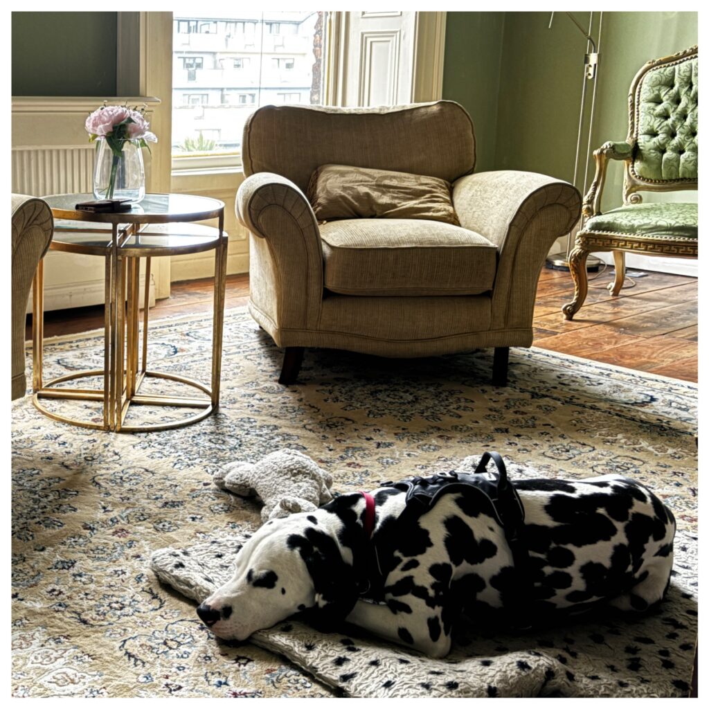 De wekker ging om 7:45 daar werd ik wakker van, dat gebeurt mij anders nooit ik ben altijd voor de wekker wakker dus snel naar Peter gelopen, maar die had de ogen ook al open. Eerst lekker naar buiten, hier hadden we wel een mooi stuk groen, waar ik lekker even heen kon. Daarna weer terug naar de kamer, al die trappen op gangen door en ja daar was de deur. De rest ging weer ontbijten en ik mijn brokken. Ik hoorde Hans nog vragen aan Peter ga jij ook voor een “Full Irisch”? Nu kan het nog. Wat Peter antwoorde hoorde ik al niet meer, want ze waren al weg.