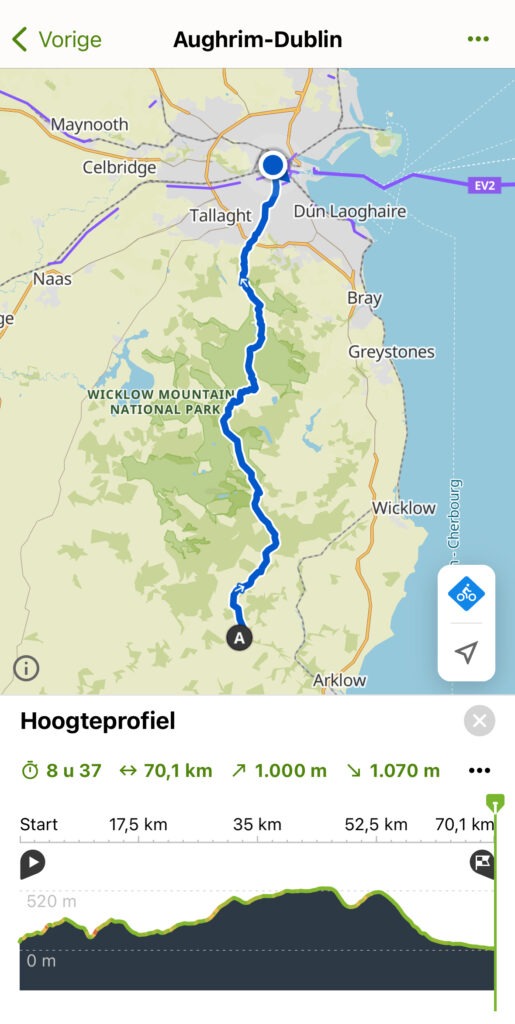 Iets later dan de bedoeling was zijn we vertrokken. Vandaag wel een paar stevige klimmen en aan het eind een mooie afdaling Dublin in.