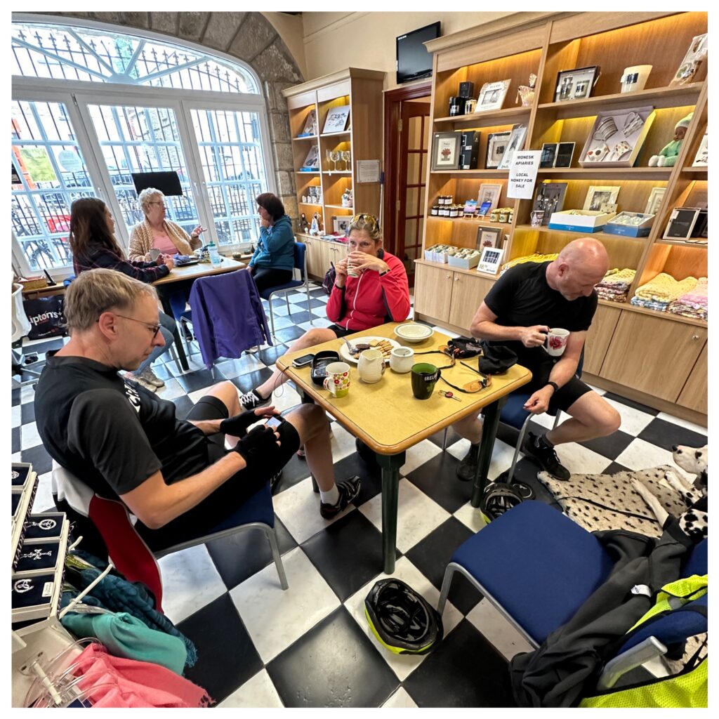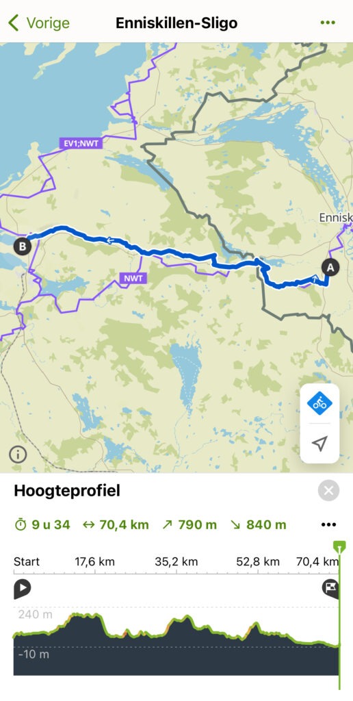 Na een poosje kwamen we in een dorpje Blacklion bleken we al in Ierland te zijn en daar was het toeristencentrum en daar hadden ze koffie. Hier naar binnen komt er een dame op me af met een klein bord ik schrok me rot dus begon te blaffen. Bleek het gewoon heel aardig een kom water voor mij te zijn. Nou dat was wel lekker. Ik mocht wel naar binnen als ze mij onder controle hadden. De rest heeft een koffie gedronken en nog even gepraat met de mensen van het toeristencentrum. Zei een vrouw opeens nadat Sieta gezegd had dat we uit Nederland kwamen, hier waren vanmorgen ook 2 mensen uit Nederland. Bleken het de mensen te zijn die we eergisteren ook hadden gezien. (Das toevallig)