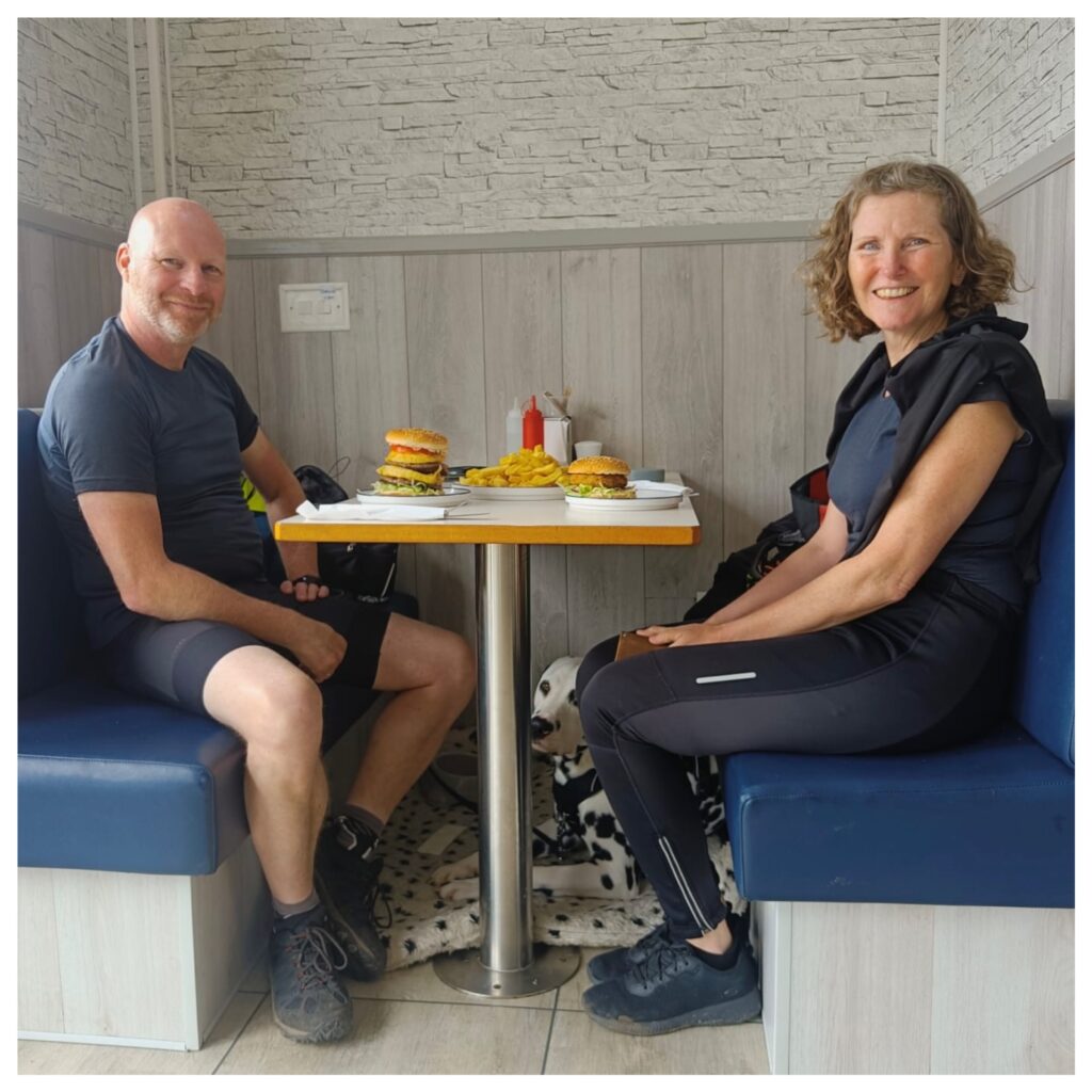We gaan weer weg. Moeten direct weer op de pedalen, want er is best wel een steile klim 14% direct na de koffie. En zo gaat het nog een tijdje door totdat Peter ineens stopt. Ik moet de bak uit en Gea gaat even met mij aan de wandel. De accu is leeg en we moeten nog een heel eind begreep ik. Als dat maar goed komt. Na een tijdje komen we voor de laatste keer in een “groot” stadje, vanaf hier is het nog een dik uur fietsen, dus we besluiten hier maar te gaan eten. We zien een chinees Hans naar binnen is het alleen maar afhaal. Op naar de volgende een soort friet van Piet maar dan op z’n Iers. Hier mag ik ook naar binnen gelukkig. Ga lekker op mijn kleedje onder de tafel liggen en eet mijn bak leeg en doe nog even een dutje.