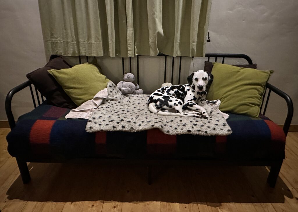 Dit is een plek waar je echt geen bereik hebt. De plek waar we slapen is een verbouwde “Barn” van een Nederlands stel. Echt back to basic koken op een houtvuur en als het echt niet anders kan mag het elektrisch. Afwassen met warm regenwater en drinkwater uit de bron. Ze zei al tegen ons als je bang bent voor spinnen moet je hier niet zijn. Eerst werd er nog een hele tijd gekletst en ondertussen is Hans begonnen met eten koken. Ik denk dat ze rond een uur of negen gingen eten. Ik had mijn brokken allang op en wilde wel even weer uit. Moest helaas nog even wachten. Na de wandeling mocht ik ook naar boven dit was best wel een steile trap. Op lukte nog wel, maar naar beneden moest Peter mij wel even helpen. Boven op de kamer had ik een eigen bed wel luxe hoor en dat sliep toch lekker, dat wil ik thuis ook wel. 🙂