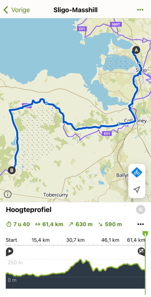 Het was wat bewolkt en het waaide flink. Het eerste stuk richting Sligo was erg druk te fietsen. In Sligo zijn we even naar de supermarkt geweest, want tot onze slaapplek komen we niets meer tegen. De dames gingen de boodschappen doen Hans, Peter en ik bleven buiten staan. Ik heb nog nooit zoveel aandacht van vrouwen gehad, maar helaas geen dalmaten teefje gezien. 🙁 En er werden weer de nodige foto’s van mij gemaakt en er riep zelfs iemand een “spoiled boy” naar mij. Geen idee wat het betekend maar klonk wel goed.