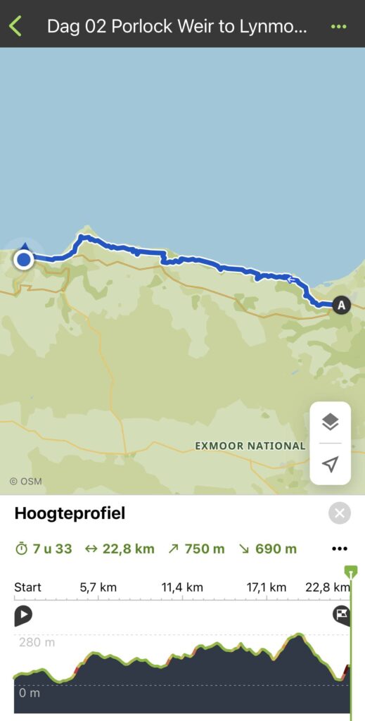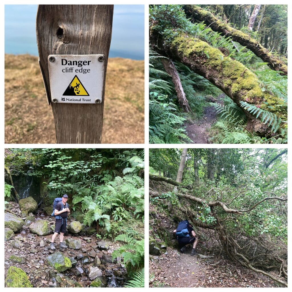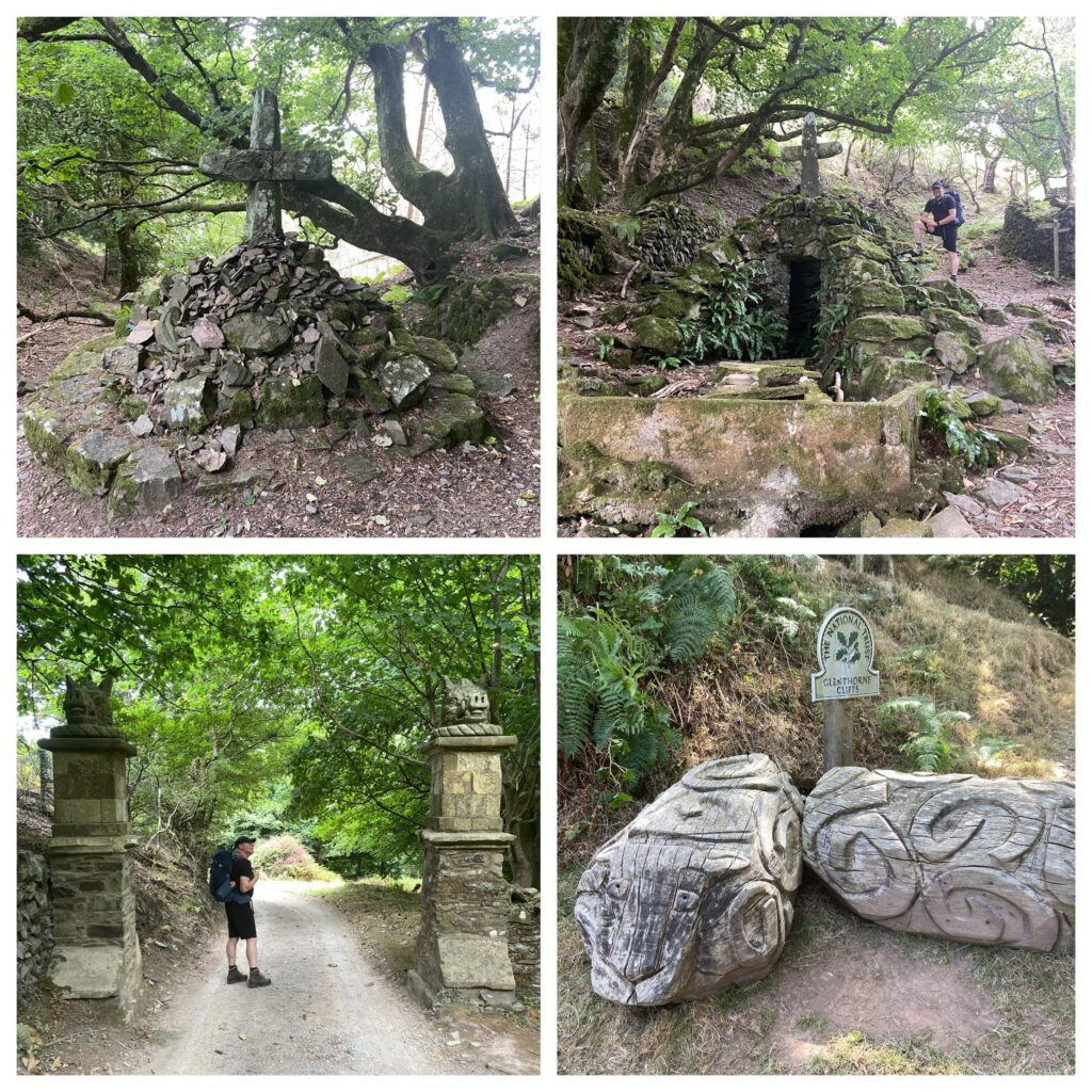 ’ S middags kwam de zon er ook bij en toen werd het heel erg warm. We zijn langs een oud tolhuis in Worthy gelopen. De linker boog is de tolweg en de rechter is het Coast Path naar Culbone. Een eindje verder hebben we de St. Beuno’s Church bezocht. Ook kwamen we langs een Sisters Fountain en we moesten door de poort van 2 pilaren met 2 wilde zwijnenkoppen lopen. We hadden tijdens de tocht wel wat hindernissen te nemen. Hier en daar waren wat bomen en stukken rots naar beneden gekomen en die lagen mooi over het pad. Soms was het pad zo smal dat als je een stapje opzij deed het waarschijnlijk nare gevolgen zou hebben.
