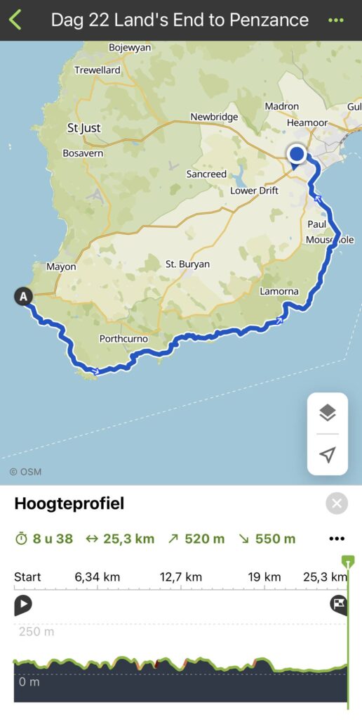 Nou dat beetje klimmen en dalen was dus gewoon stevig klimmen en dalen. Door de harde wind ging de zee aardig te keer op de kust wat we soms voelden als een motregen. Het landschap is hier toch wel weer anders dan voor Landβs End