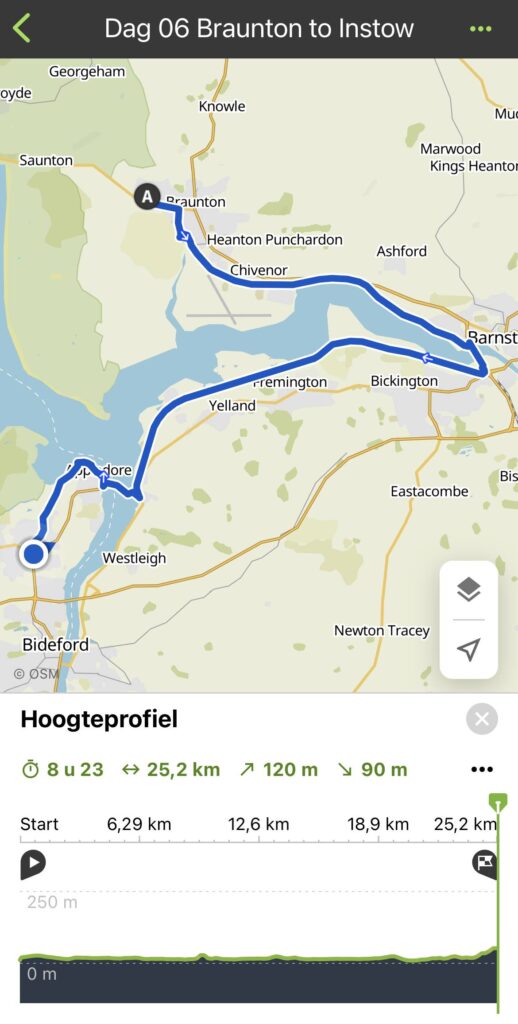 Vanmorgen vroeg opstaan, want we moeten de boot halen in Instow en het is nog een goede 20 kilometer lopen. De boot vaart alleen als het hoogtij is en uitgerekend vandaag is dit maar heel kort. Hij vaart van 10.00 tot 13:00.